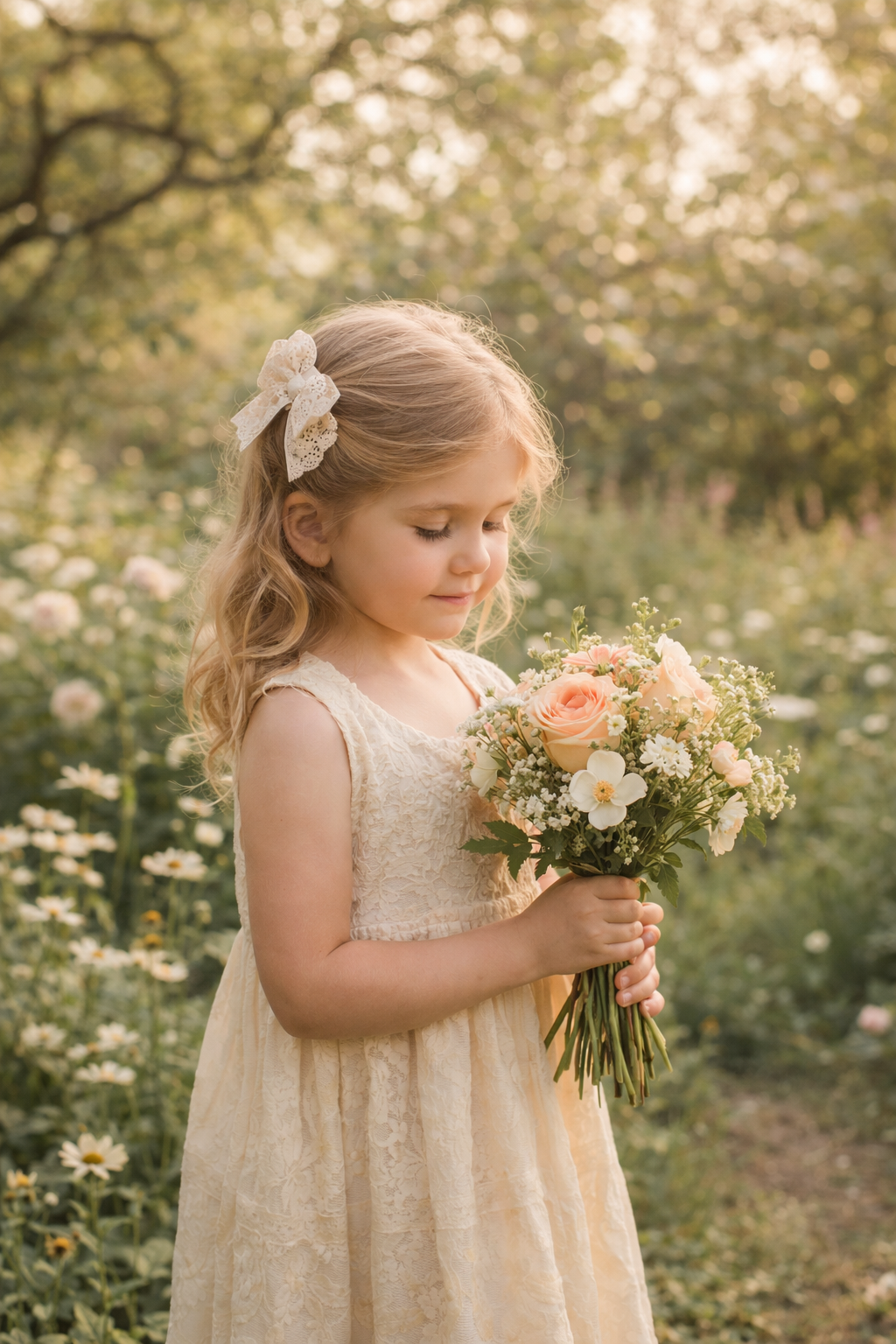 sunlight through garden leaves, tiny hands holding wildflowers, and dresses that twirl softly in the breeze.